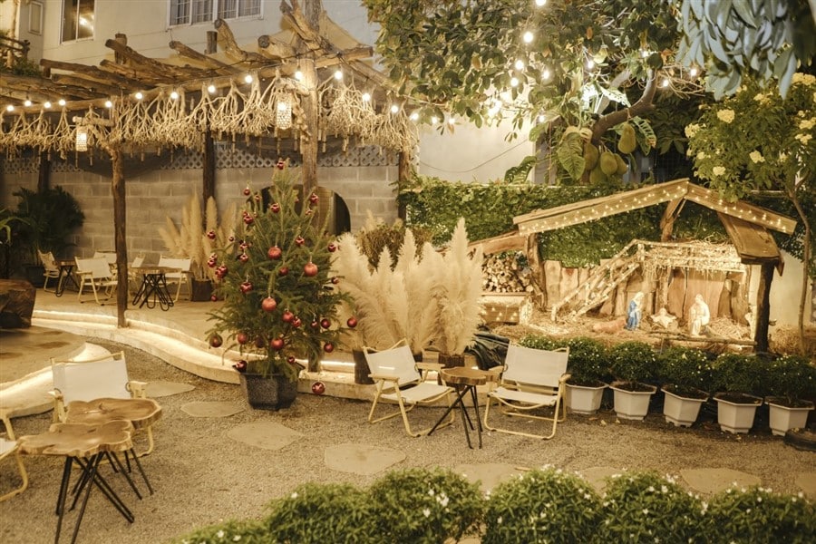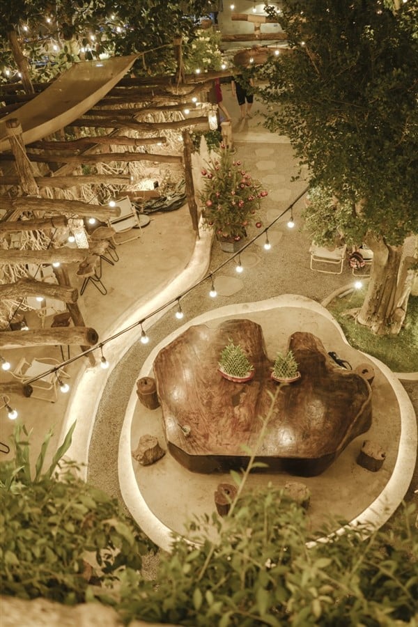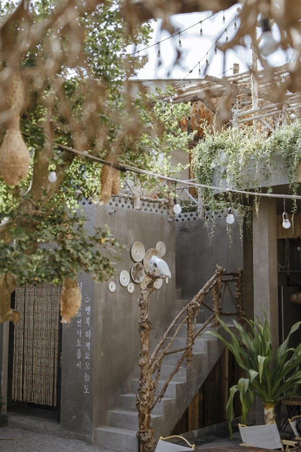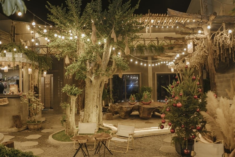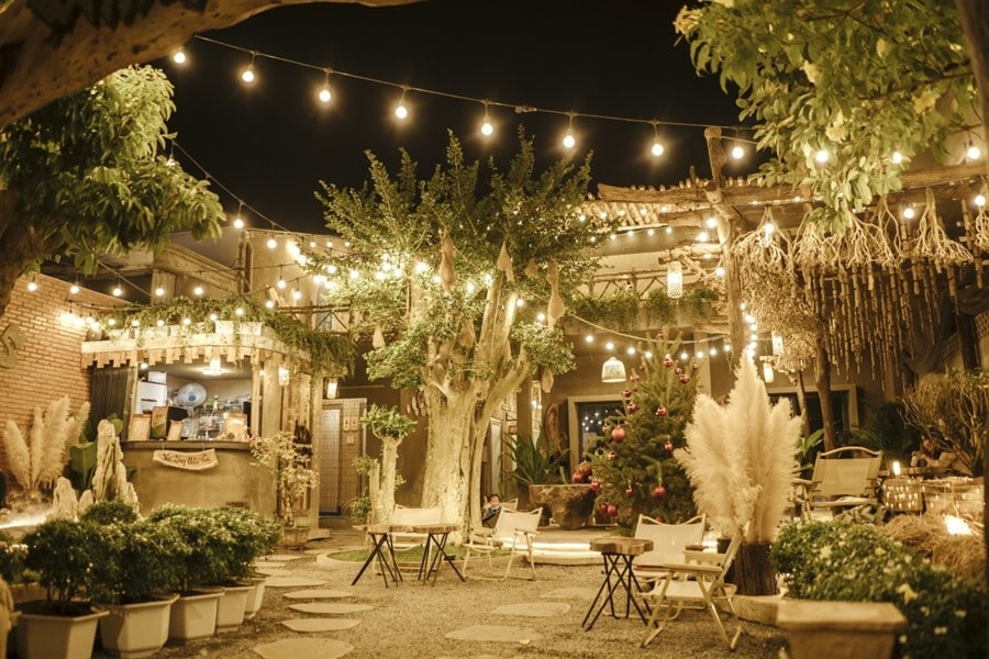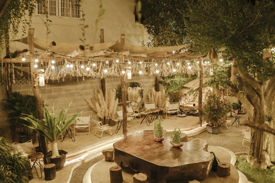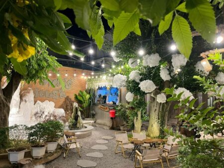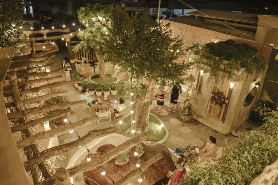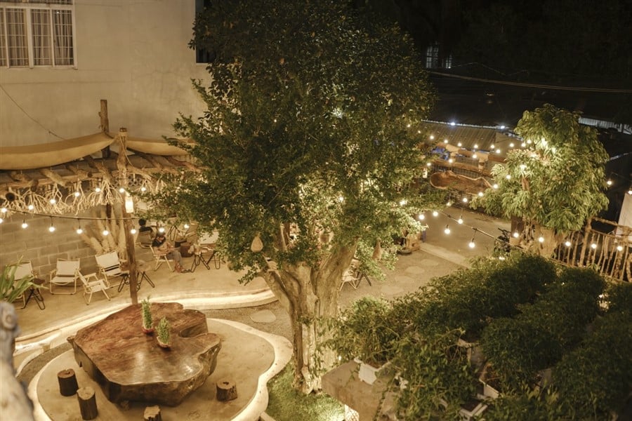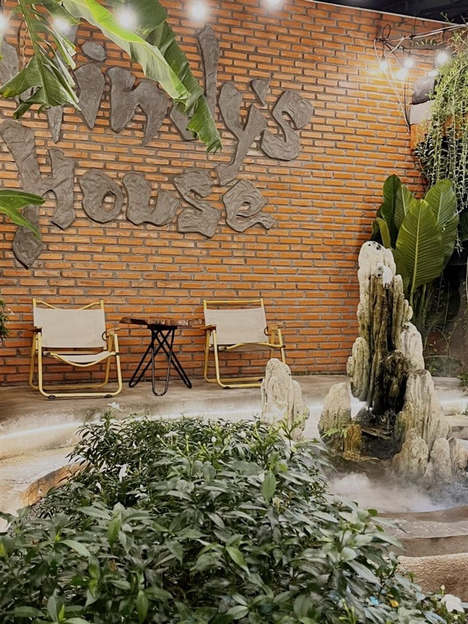 Phía trước nhà là sân vườn rộng với nhiều cây xanh và quán café mini. Đây là nơi lý tưởng để nhâm nhi cà phê buổi sáng hoặc chill nhẹ cùng bạn bè vào buổi tối.