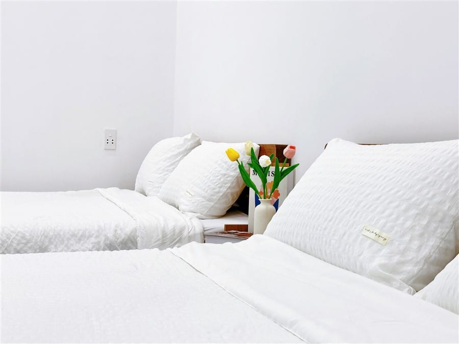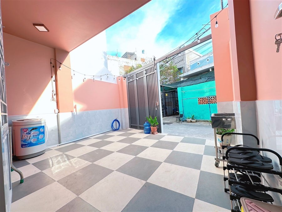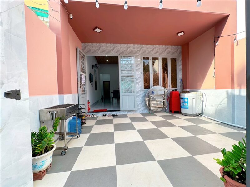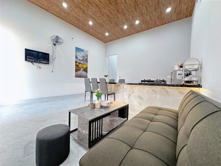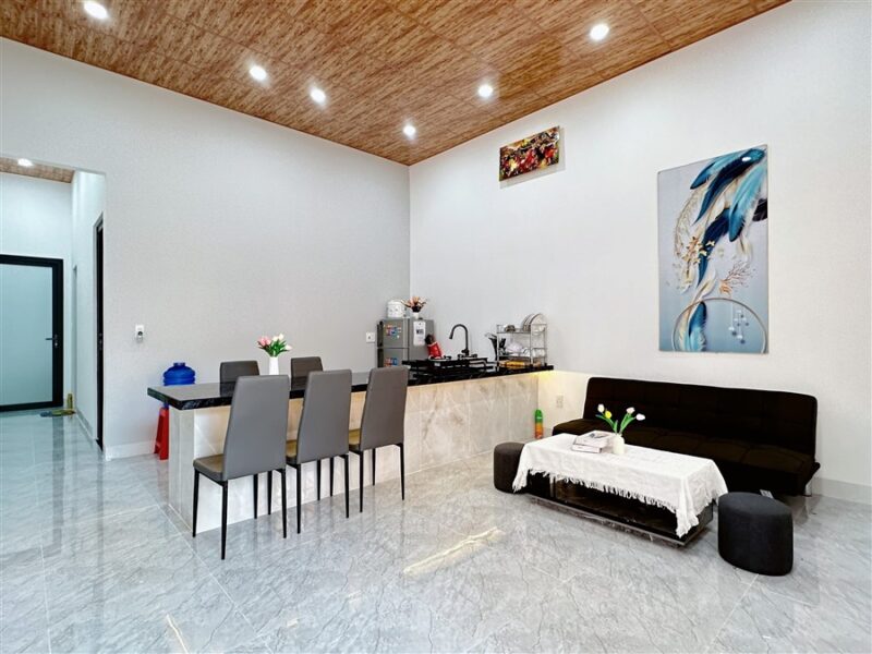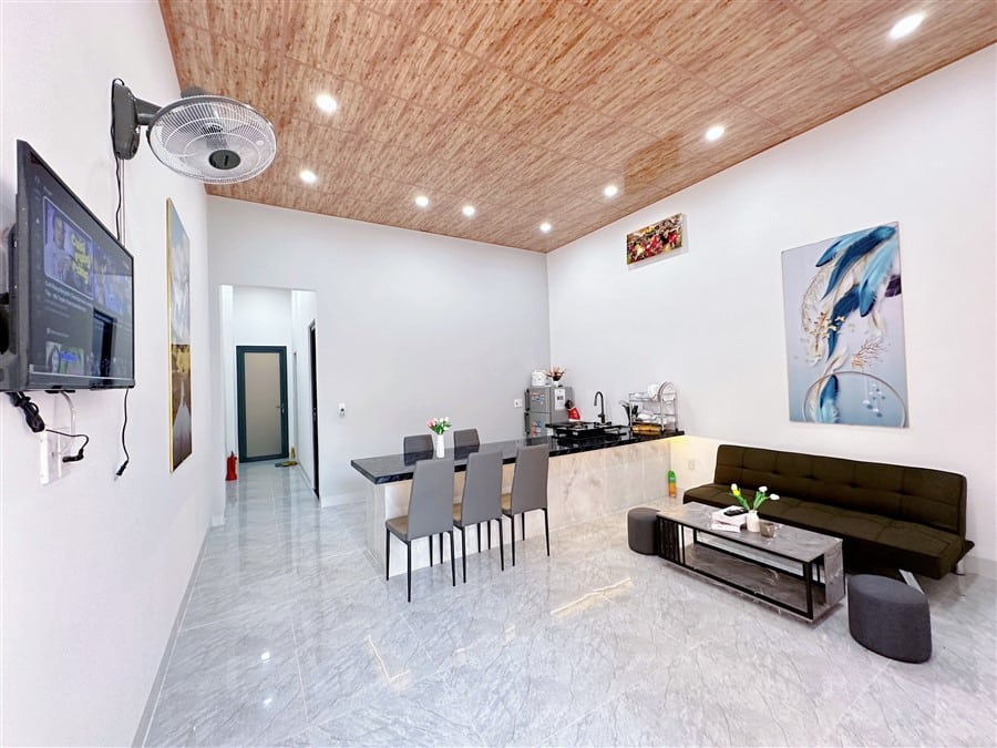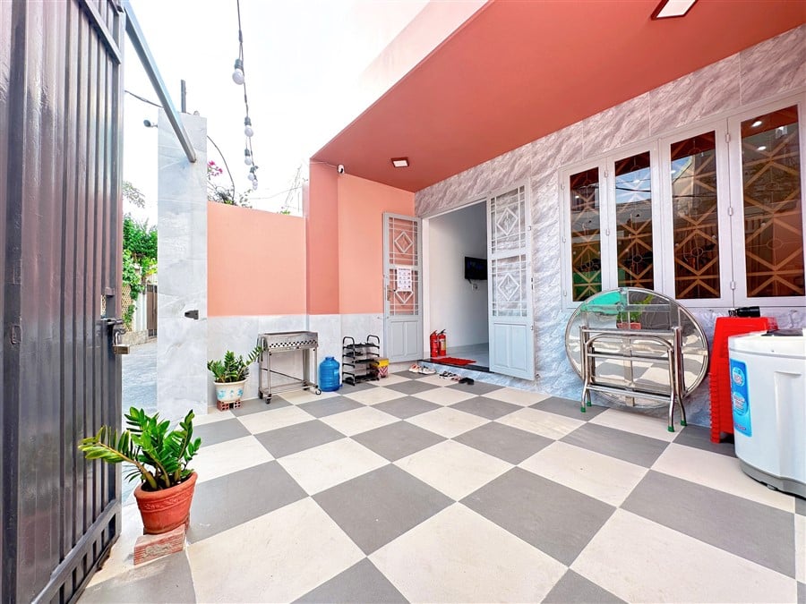 Căn nhà phố gồm 2 phòng ngủ với 3 giường và 2 nệm phụ, kèm sofa bed, sức chứa tiêu chuẩn 8 khách và tối đa lên tới 15 khách. Nhà có 2 WC riêng, phòng khách rộng rãi, bếp đầy đủ dụng cụ nấu nướng, gia vị cơ bản, lò nướng than và bàn ghế làm tiệc BBQ ngoài trời. Nội thất hiện đại bao gồm tủ lạnh, máy giặt, TV, máy lạnh, Wi-Fi, máy sấy tóc, bàn ủi và đồ dùng vệ sinh cá nhân, mang đến trải nghiệm nghỉ dưỡng tiện nghi và thoải mái.