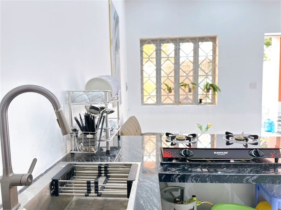 ✅ Bếp đầy đủ dụng cụ nấu ăn, gia vị, lò nướng than, bàn ghế BBQ