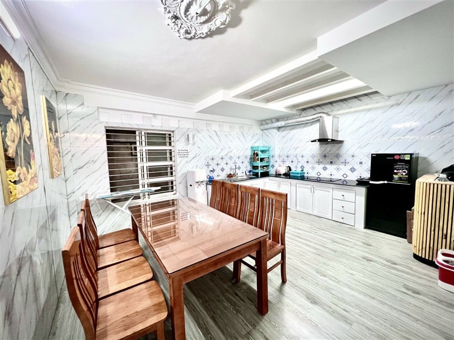 1 phòng khách và 1 phòng bếp đầy đủ tiện nghi như TV Smart, tủ lạnh, máy giặt, máy lạnh, máy lọc nước, bếp từ, bếp lẩu, bếp nướng, bàn ủi, máy sấy, quạt lớn