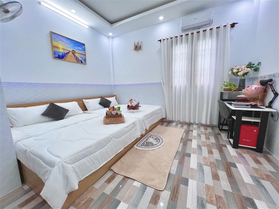 Nhà phố gồm 1 trệt và 1 lầu, với 2 phòng ngủ gồm 1 phòng đơn và 1 phòng đôi, 3 giường (1 giường 2m x 2m, 2 giường 1,8m) cùng 6 nệm phụ, sức chứa tối đa lên tới 17 khách. Phòng khách và bếp được trang bị máy lạnh, nội thất hiện đại, vật dụng nấu nướng đầy đủ, mang đến trải nghiệm nghỉ dưỡng thoải mái như ở chính ngôi nhà của bạn.