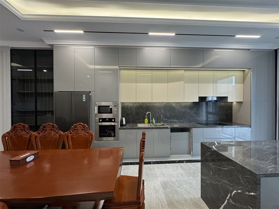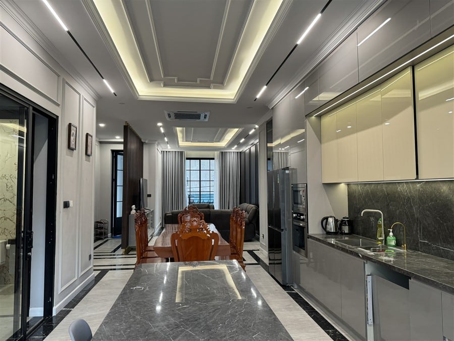 Thiết kế sang trọng: nội thất cao cấp, bếp và phòng khách hiện đại, mang đến trải nghiệm nghỉ dưỡng đẳng cấp.