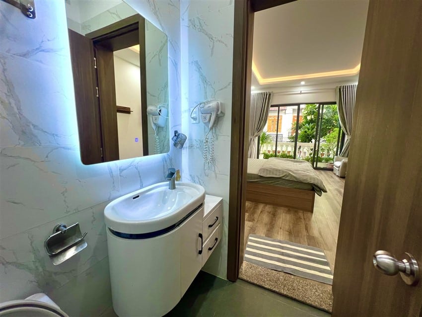 Trang bị đầy đủ tiện nghi: WC riêng từng phòng, nhà bếp, sân thượng, hồ san hô, tiểu cảnh, loa karaoke