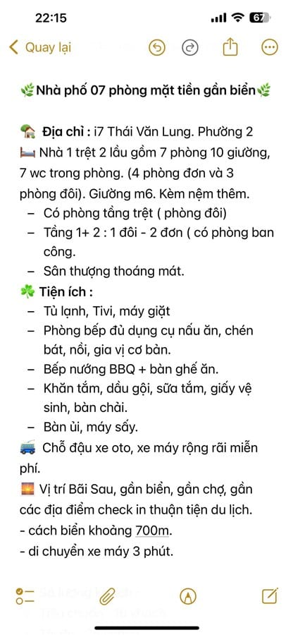 Nhà phố i7 Thái Văn Lung là lựa chọn lý tưởng cho các gia đình, nhóm bạn hoặc đoàn công ty muốn nghỉ dưỡng tại Vũng Tàu với không gian rộng rãi, tiện nghi và riêng tư. Chỉ cách biển Bãi Sau khoảng 3 phút đi xe (khoảng 600m), căn nhà mang đến sự thuận tiện tối đa để tận hưởng những buổi sáng trên bãi biển, tham gia các hoạt động giải trí hay đơn giản là dạo bộ ngắm cảnh biển. Đây là một trong những nhà phố cho thuê theo ngày được nhiều khách ưa chuộng nhờ vị trí gần biển, thiết kế hiện đại và tiện nghi đầy đủ.