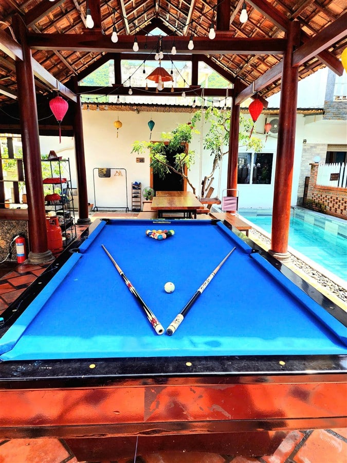 Villa còn có phòng karaoke với loa kéo miễn phí và bàn bida, tạo không gian giải trí trọn vẹn cho các buổi tụ họp, vui chơi. Khu bếp hiện đại được trang bị đầy đủ dụng cụ nấu nướng, xoong nồi, ly chén và gia vị cơ bản, kết hợp bàn ghế ăn rộng rãi, thuận tiện cho các bữa ăn gia đình hoặc nhóm bạn. Phòng khách rộng, thoáng, ban công lớn giúp du khách vừa nghỉ ngơi vừa thưởng thức không khí trong lành và view sân vườn.