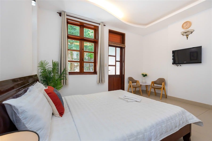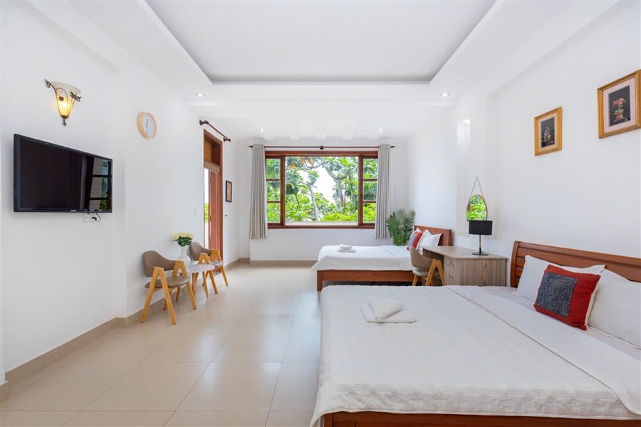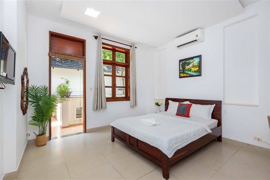 Trang bị phòng: Máy lạnh, sofa, tủ quần áo, rèm chống muỗi, không gian rộng rãi, thoáng mát.