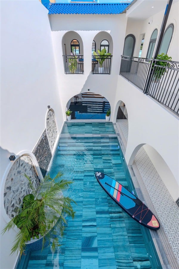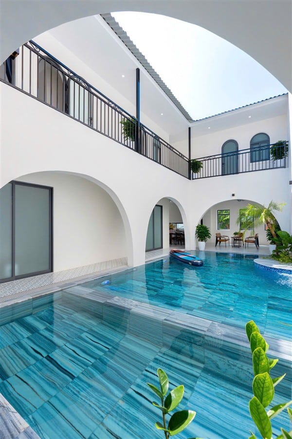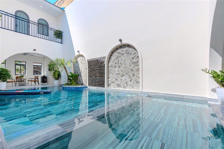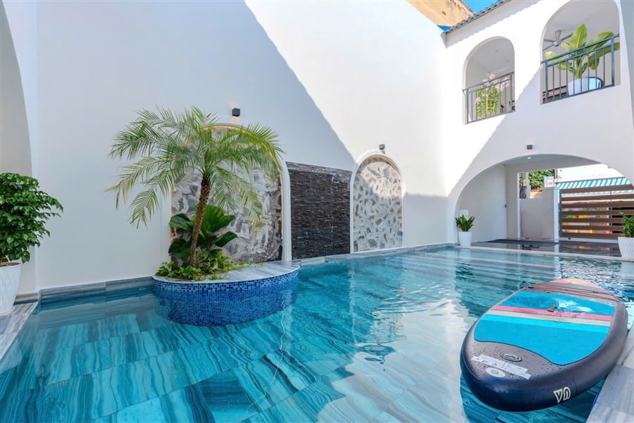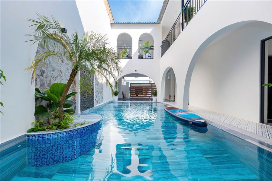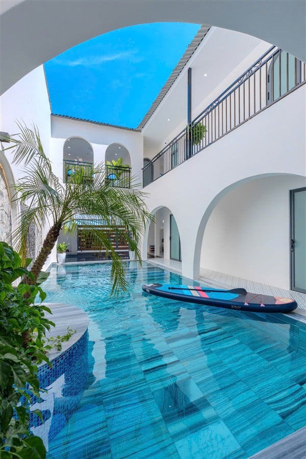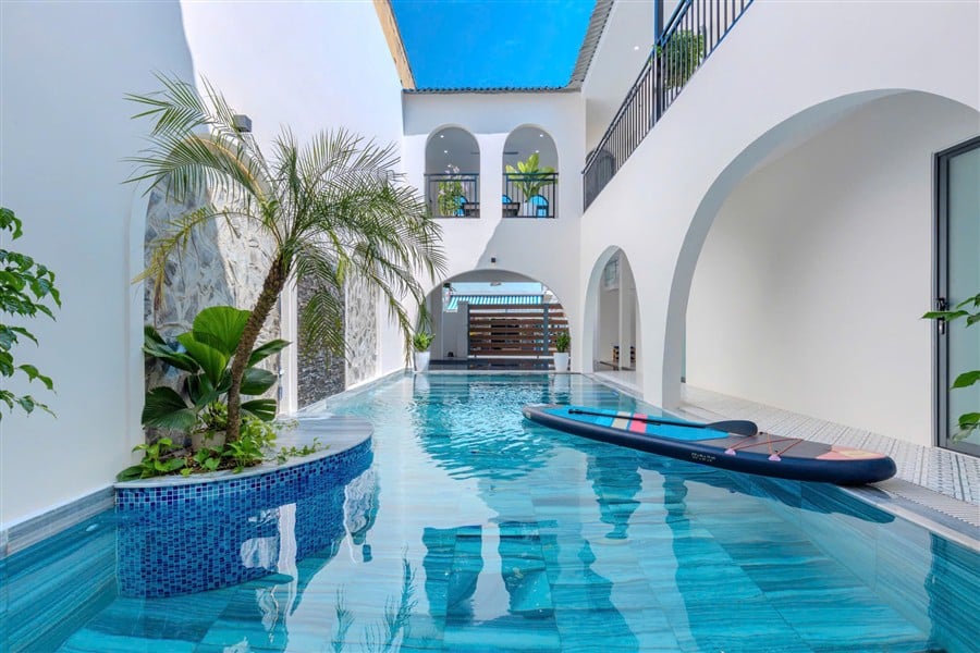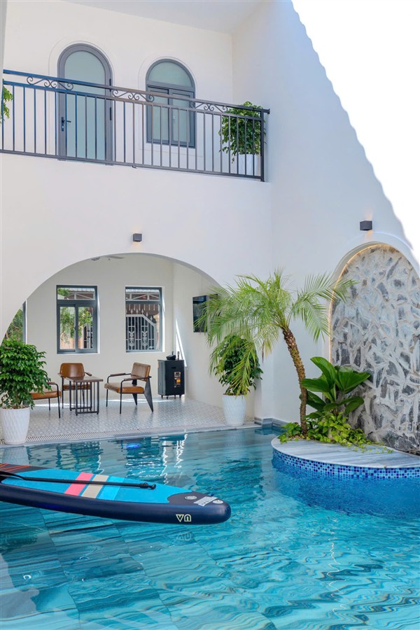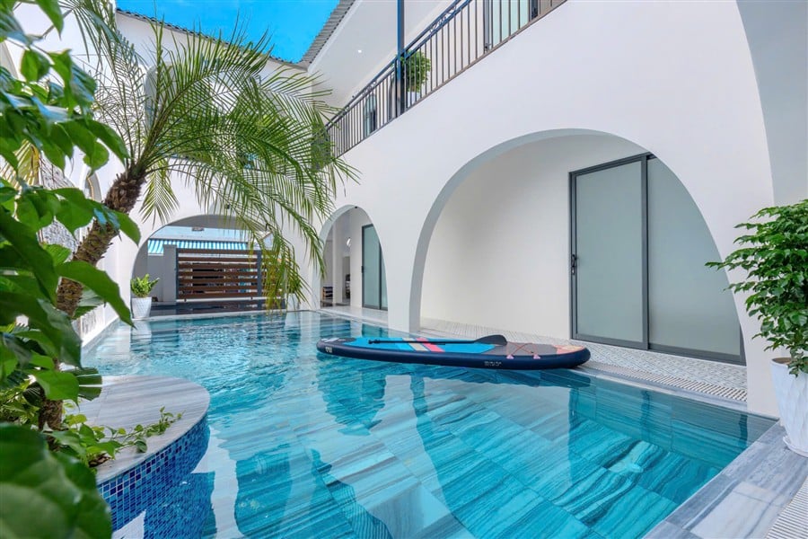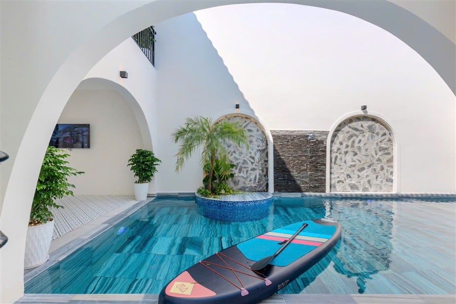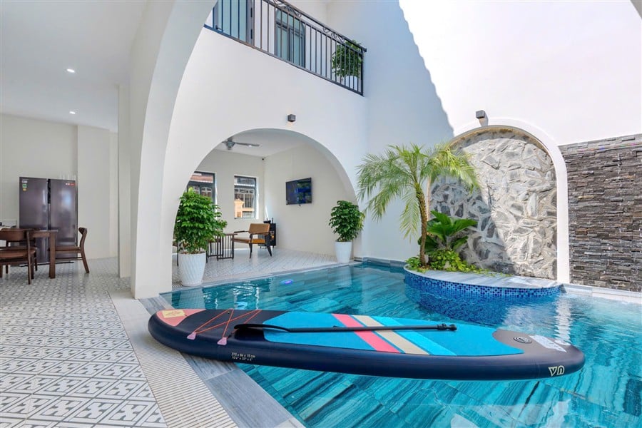 Hồ bơi ngoài trời 50m², thuyền SUP miễn phí, sân BBQ, phòng karaoke, bàn bida và ghế massage