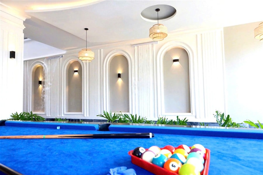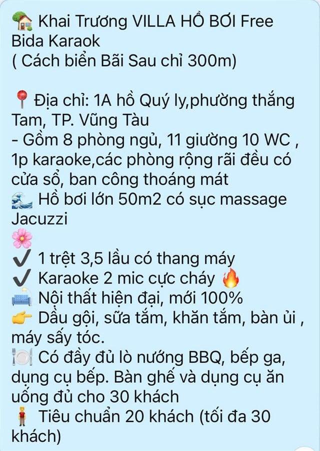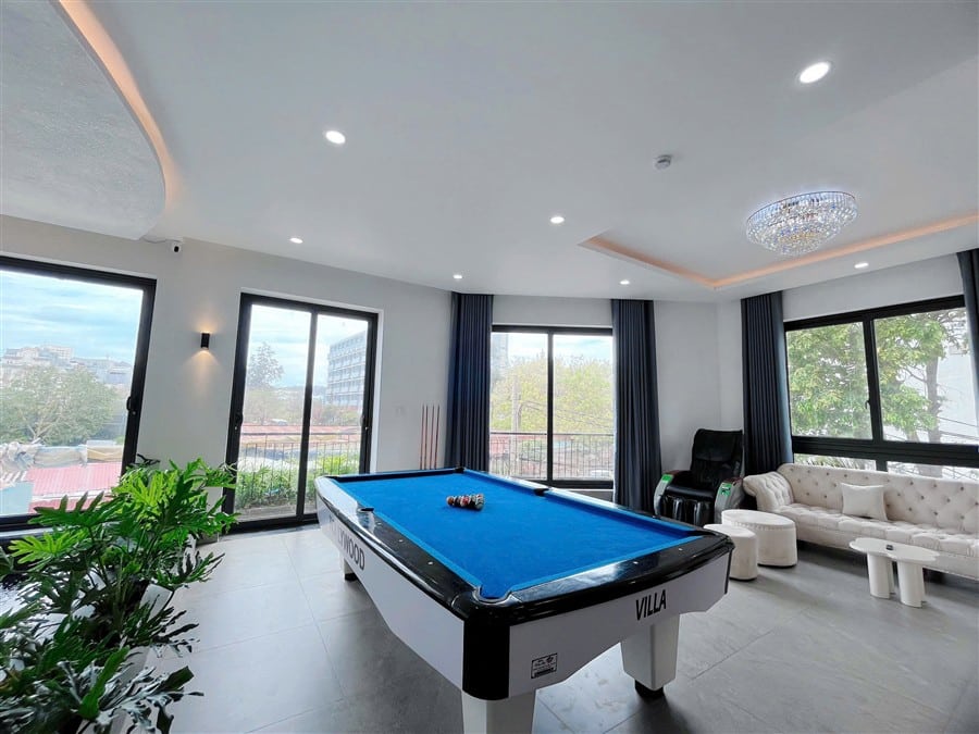 Villa có 8 phòng ngủ với tổng 11 giường lớn, 11 phòng vệ sinh riêng, cùng 4 nệm dự phòng, sức chứa tối đa lên đến 35 khách. Hồ bơi rộng 50m² với sục massage, kết hợp phòng karaoke, bàn bida và phòng khách máy lạnh tạo không gian giải trí trọn vẹn. Sân thượng rộng rãi với bếp nướng BBQ, bếp điện, dụng cụ ăn uống và gia vị cơ bản giúp tổ chức tiệc nhóm hoặc liên hoan gia đình thoải mái.