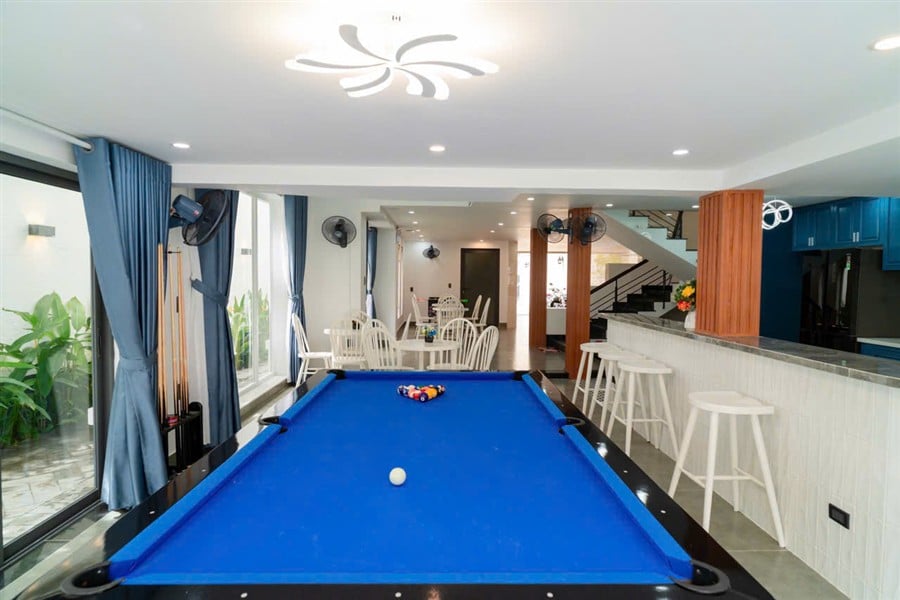 Căn villa gồm 8 phòng ngủ, 12 giường (8 giường lớn và 5 giường tầng), 9 phòng vệ sinh, đủ sức chứa tối đa lên đến 30 khách. Hồ bơi rộng 40m² cùng khu vực giải trí đầy đủ tiện nghi như karaoke, bida, xông hơi, bi lắc miễn phí mang đến không gian thư giãn và giải trí lý tưởng.