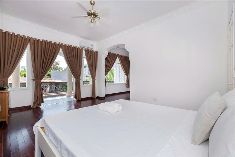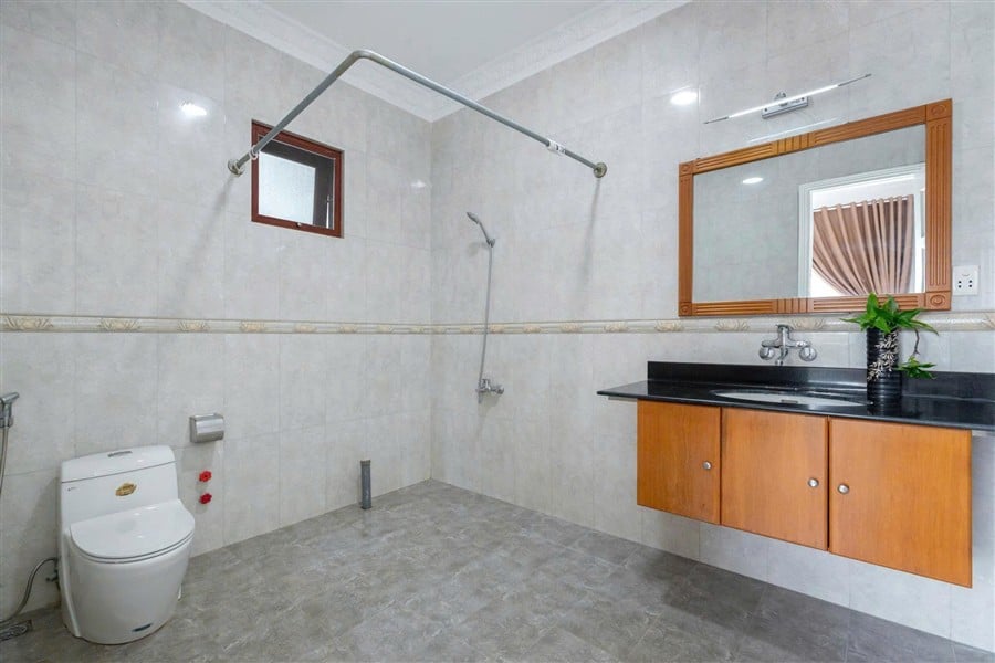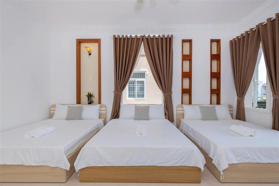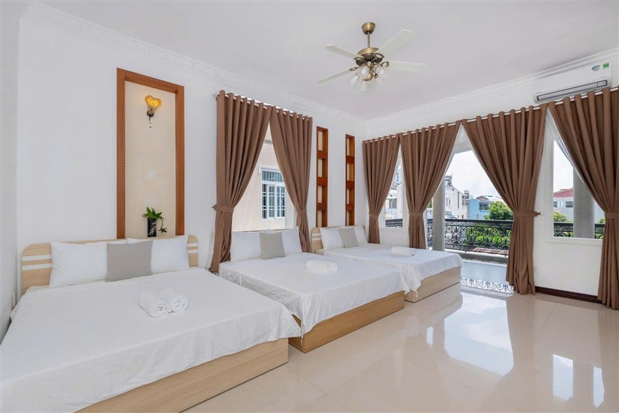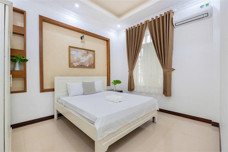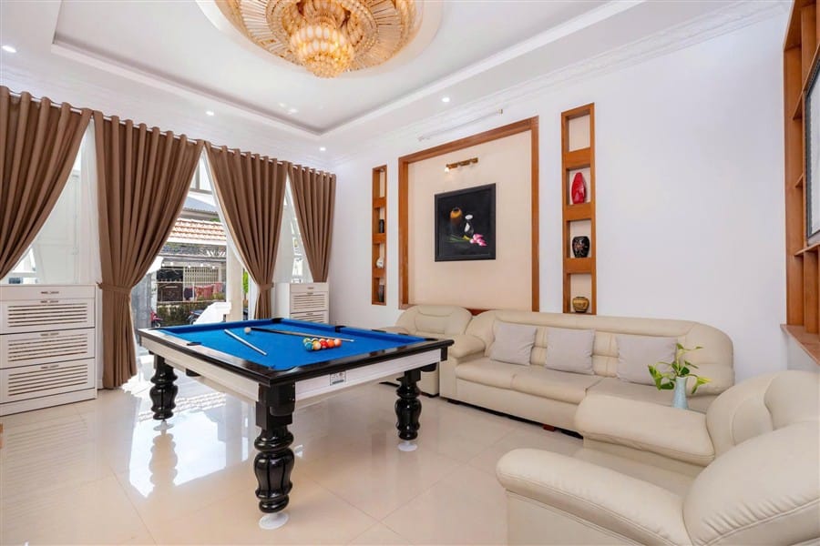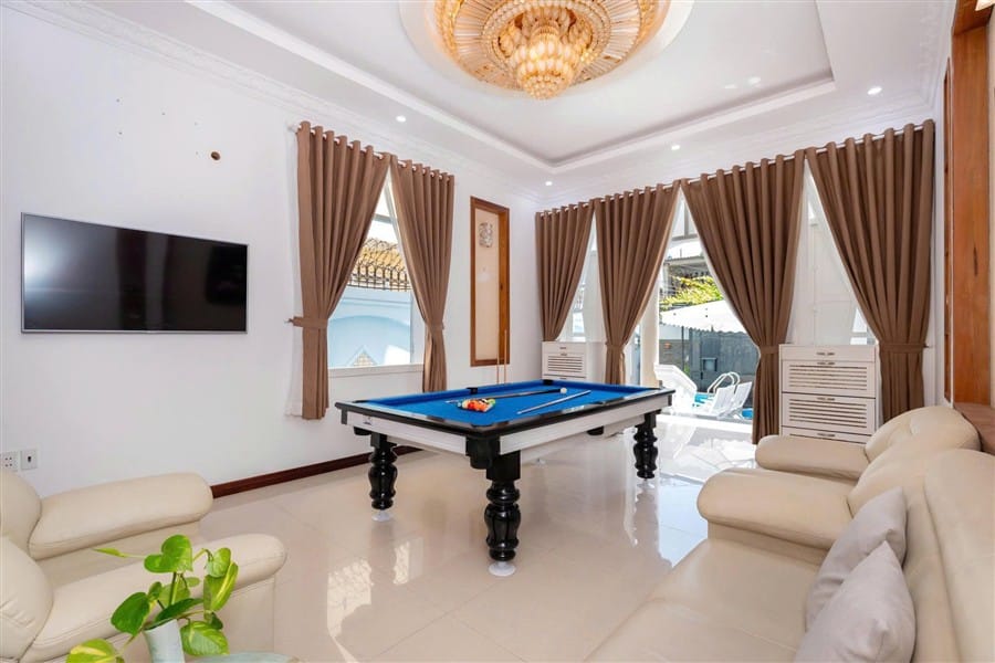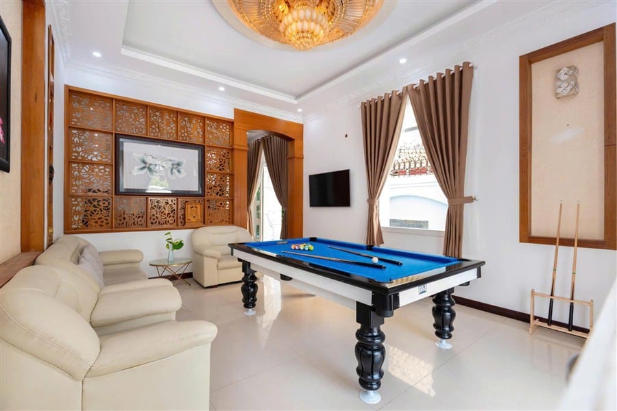Villa có tổng cộng 5 phòng ngủ, gồm 3 phòng đơn 1 giường, 1 phòng đôi 2 giường và 1 phòng tập thể 4 giường, kèm nệm phụ, sức chứa tiêu chuẩn 15 khách và tối đa 25 khách lớn nhỏ khi sử dụng thêm nệm. Tất cả phòng đều có WC riêng, máy lạnh, ban công thoáng mát và nội thất hiện đại, đảm bảo sự thoải mái tối đa cho tất cả thành viên. Nội thất bao gồm TV màn hình lớn, sofa sang trọng, bàn bida mini, ghế massage và phòng karaoke riêng với hệ thống âm thanh cao cấp, mang đến trải nghiệm thư giãn và giải trí trọn vẹn.