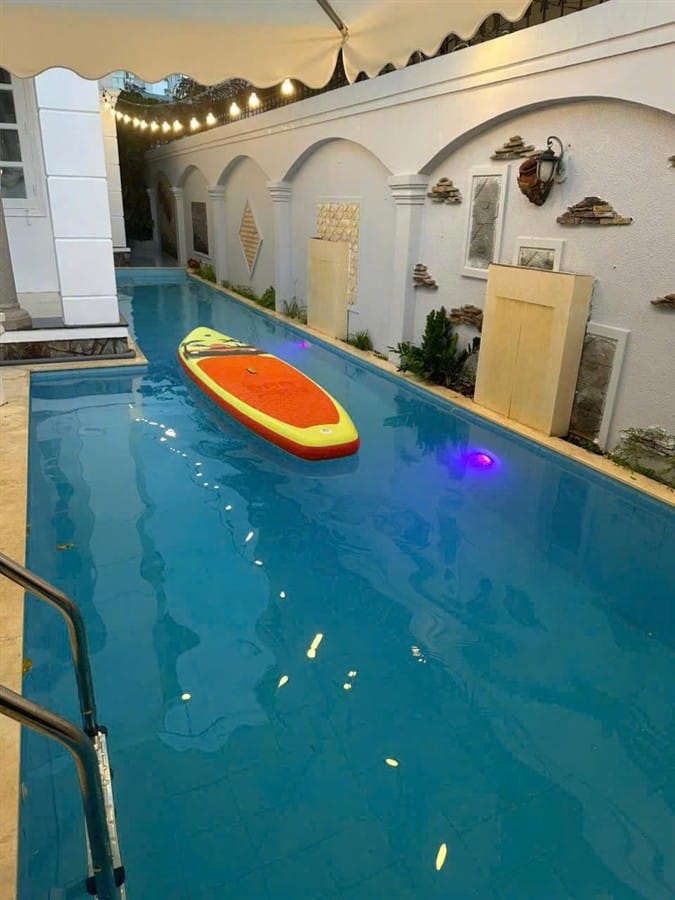 Hồ bơi riêng rộng 50m², có khu vực dành cho trẻ em và view thoáng mát, là nơi lý tưởng để thư giãn, bơi lội hoặc tổ chức các trò chơi dưới nước. Sân vườn và sân BBQ cạnh hồ bơi rộng rãi, kết hợp lò nướng ngoài trời và bàn ghế ăn ngoài trời, tạo không gian hoàn hảo cho các bữa tiệc BBQ, party cuối tuần hoặc các buổi tụ họp nhóm bạn. Villa còn cung cấp miễn phí thuyền SUP cho khách trải nghiệm, đảm bảo những phút giây giải trí và khám phá biển thêm thú vị.