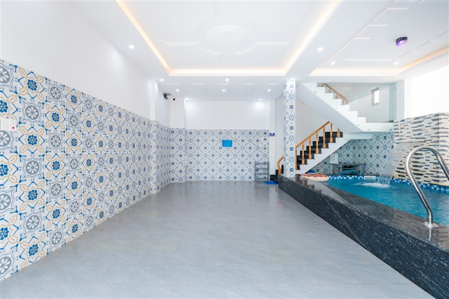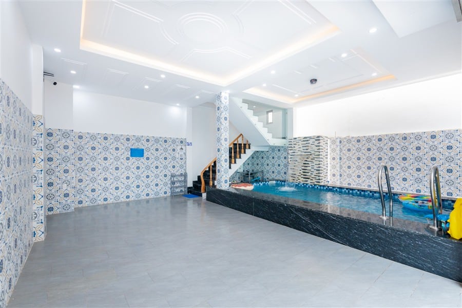 Hồ bơi riêng rộng 30m² được trang bị phao bơi miễn phí, là nơi lý tưởng để thư giãn, tắm nắng hoặc tổ chức các hoạt động vui chơi ngoài trời. Villa còn có phòng karaoke máy lạnh với loa kéo và 2 micro miễn phí, giúp cả gia đình hoặc nhóm bạn thoải mái hát hò, giải trí. Khu bếp đầy đủ dụng cụ nấu nướng, bếp BBQ ngoài trời giúp tổ chức tiệc nướng tiện lợi, kết hợp với phòng khách rộng rãi thoáng mát, tạo không gian sinh hoạt chung thoải mái.