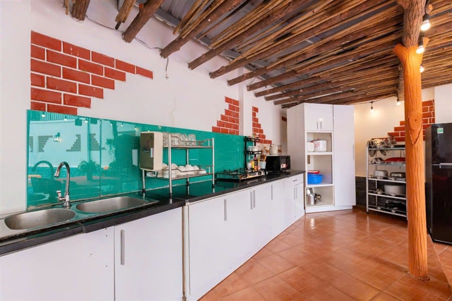Bếp đầy đủ dụng cụ nấu ăn, gia vị cơ bản, lò nướng, bếp gas, xoong nồi, chén bát