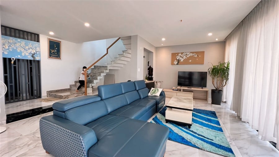 🏠 Phòng khách rộng & sang trọng: Thiết kế hiện đại, trang bị Smart TV, sofa cao cấp, ánh sáng ấm cúng.
