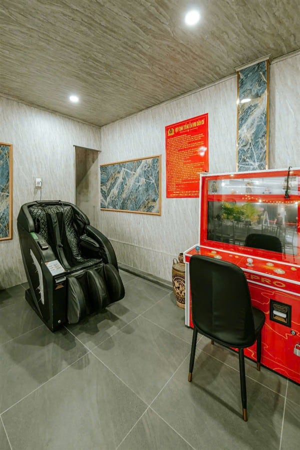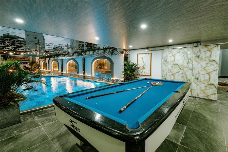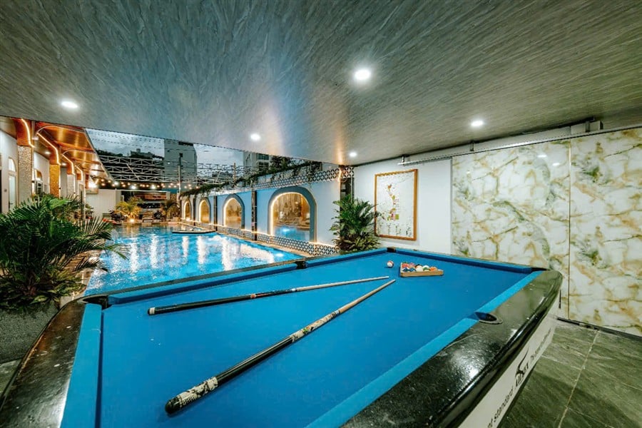 ✅ Phòng khách máy lạnh, sofa sang trọng, TV màn hình lớn, khu giải trí: bàn bida, karaoke riêng, ghế massage