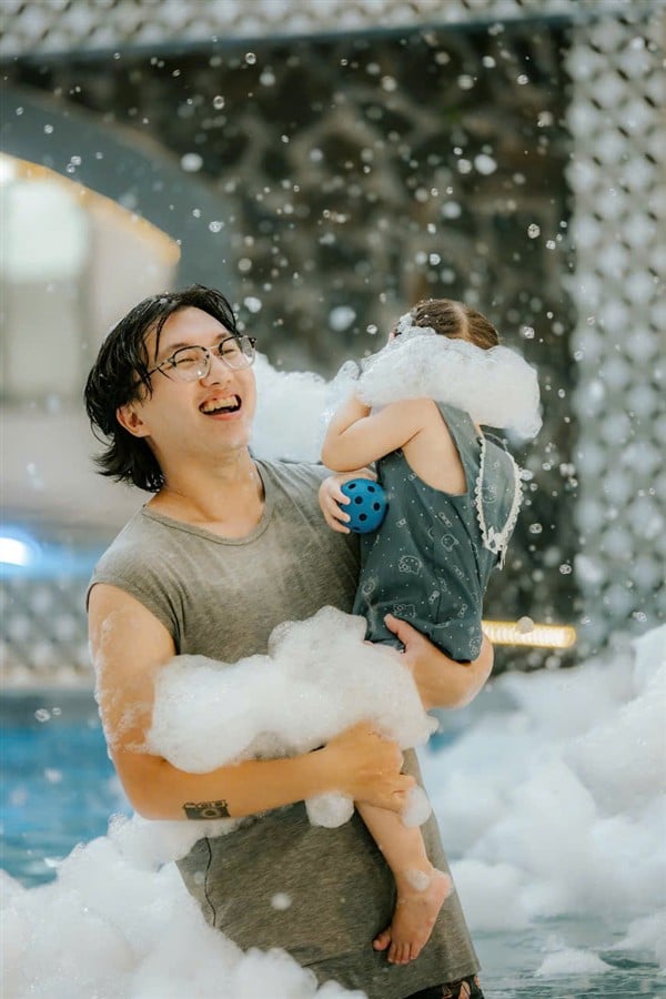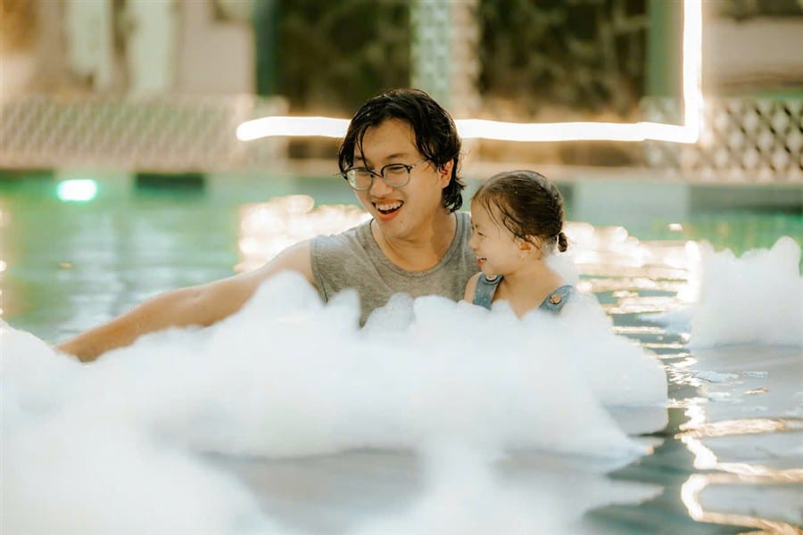 Hồ bơi chính rộng 120m² với khu vực trẻ em 60cm, phao bơi, sup miễn phí và máy bắn tạo bọt tuyết mang đến trải nghiệm vui chơi độc đáo.