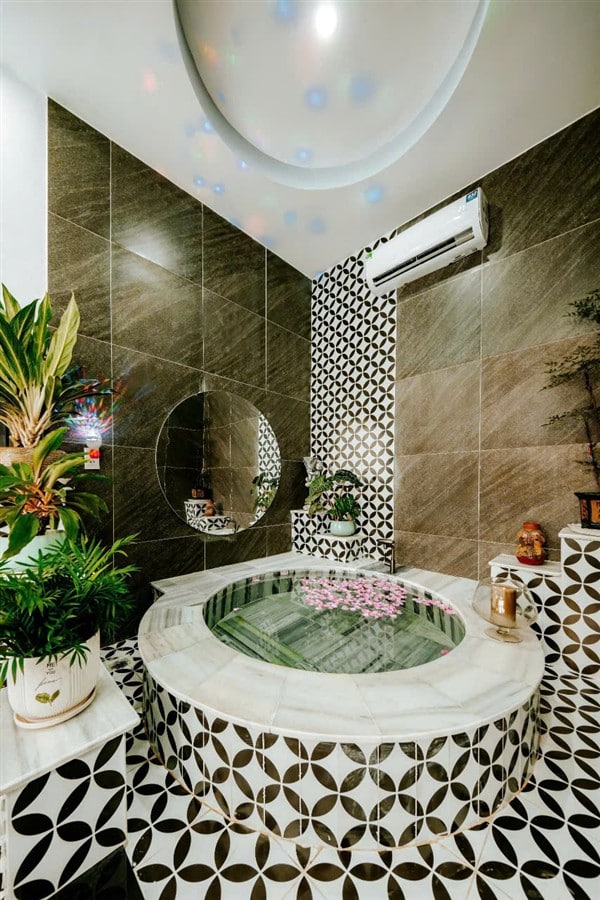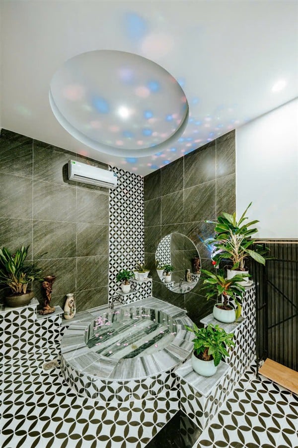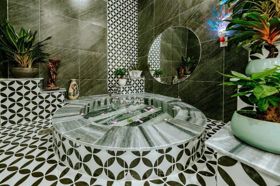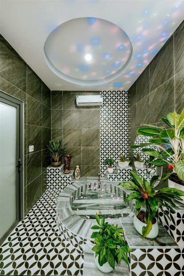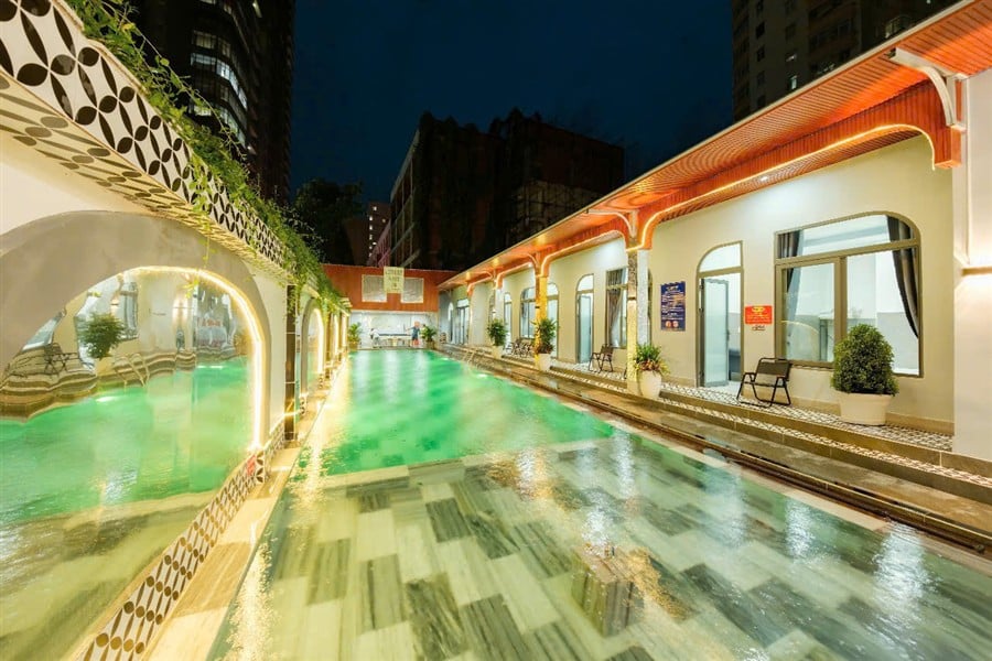 Tầng trệt: Hồ bơi 120m², khu vực riêng cho trẻ em 60cm, thiết kế kiểu Địa Trung Hải, 1 phòng VIP với bồn tắm, 1 phòng đôi và 1 WC riêng.