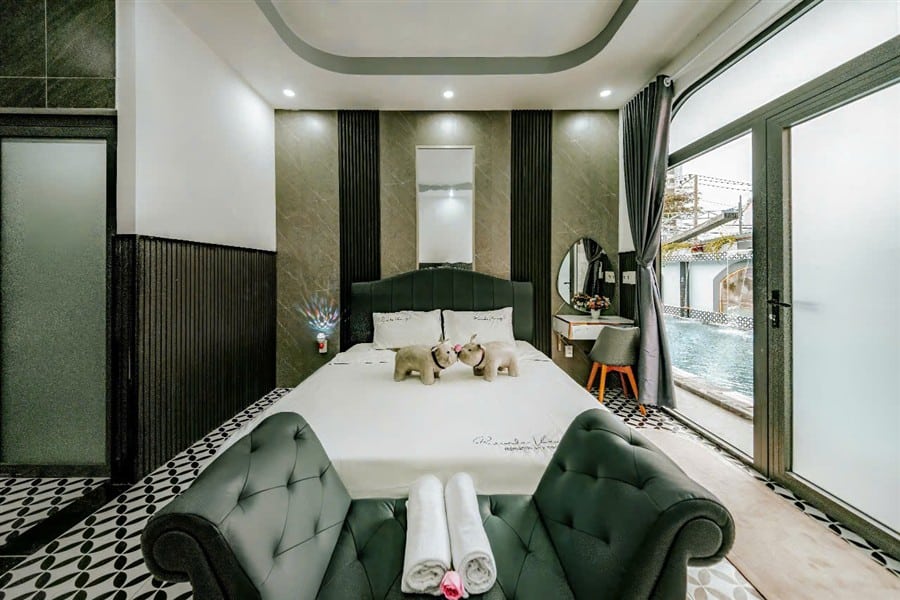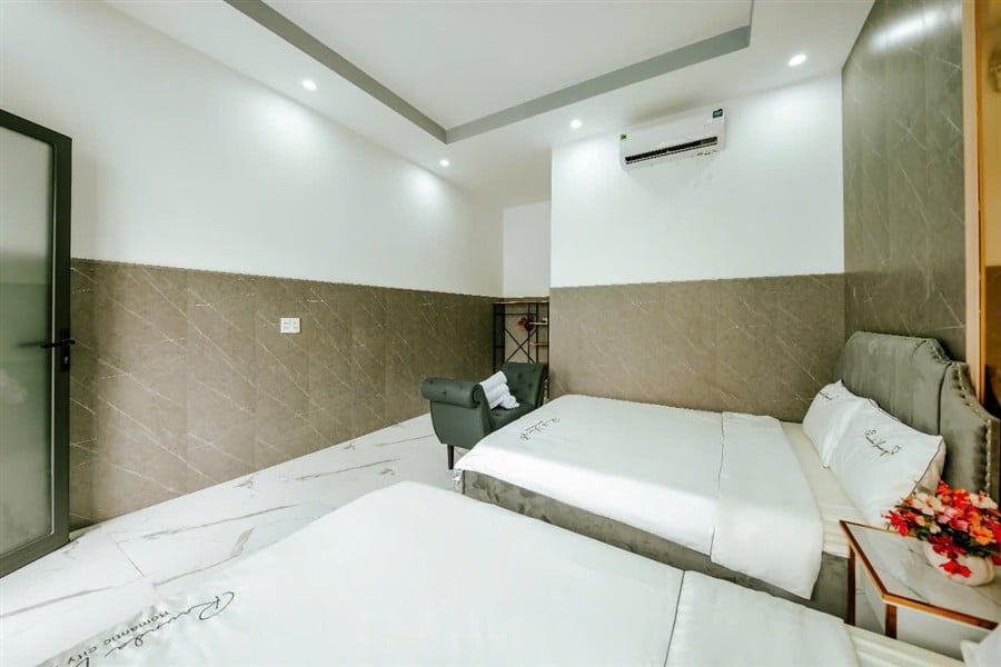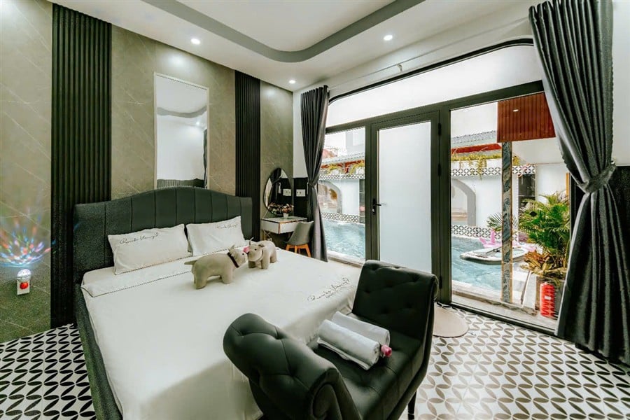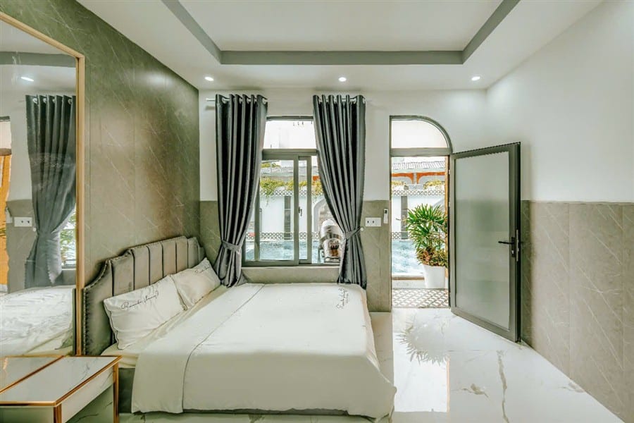 Mỗi phòng được trang bị máy lạnh, nội thất hiện đại, tủ quần áo, rèm chống muỗi, mang đến không gian nghỉ dưỡng thoải mái, riêng tư và tiện nghi.