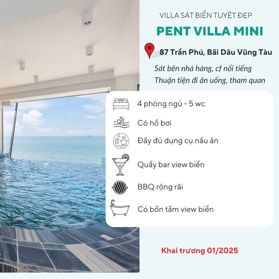 Nằm ngay trên đường Trần Phú, Villa 87 Trần Phú là lựa chọn lý tưởng cho nhóm từ 8–15 khách muốn trải nghiệm Villa Vũng Tàu sát biển với không gian sang trọng và tiện nghi hiện đại. Với vị trí sát biển, du khách có thể vừa nghỉ ngơi vừa tận hưởng trọn vẹn khung cảnh biển Bãi Sau tuyệt đẹp.