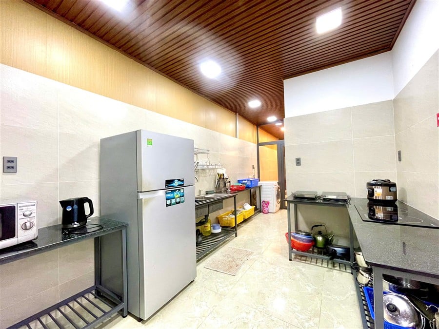 Bếp đầy đủ dụng cụ nấu ăn, gia vị cơ bản, lò nướng, bàn ghế ăn uống
