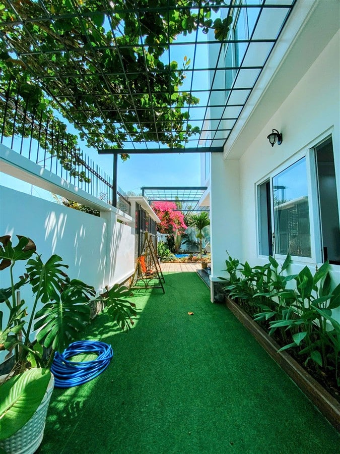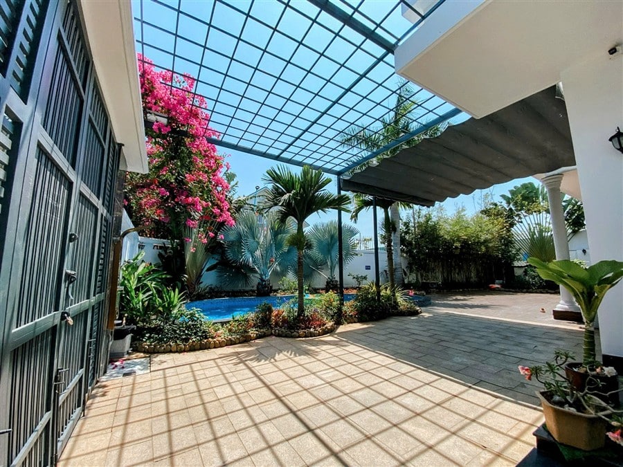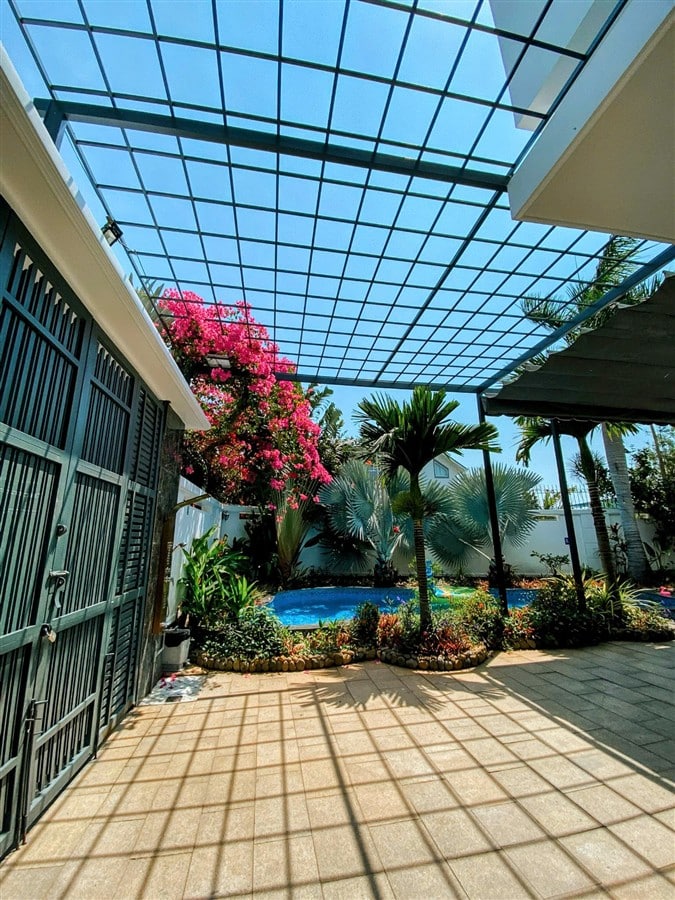Sân trong và sân trước rộng rãi đủ chỗ đậu 2–3 ô tô 7 chỗ, xe 16–30 chỗ ra vào và quay đầu thuận tiện. Không gian ngoài trời, hồ bơi và sân thượng tạo điều kiện hoàn hảo cho các hoạt động vui chơi, tổ chức tiệc hoặc nghỉ dưỡng dài ngày.