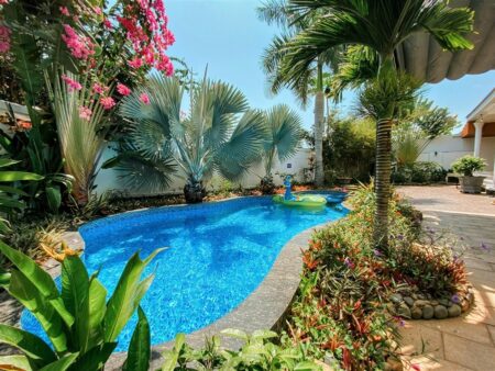 Tầng trệt: 2 phòng ngủ, trong đó có 1 phòng tích hợp karaoke với 5 sofa bed và WC riêng; phòng khách rộng rãi, bếp, hồ bơi 25m², bàn bida.