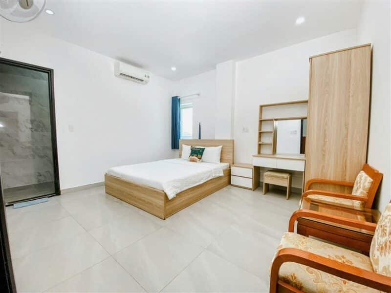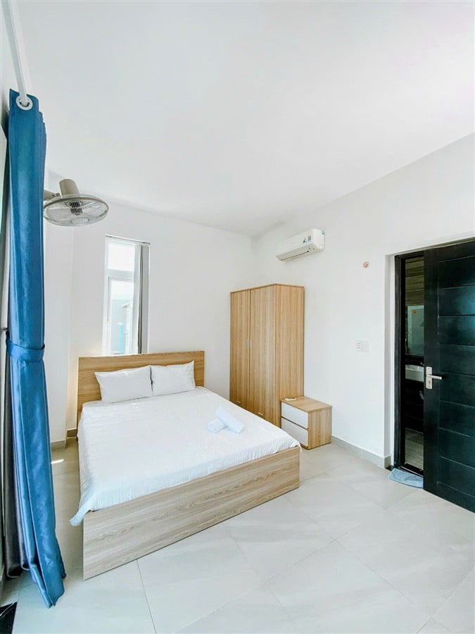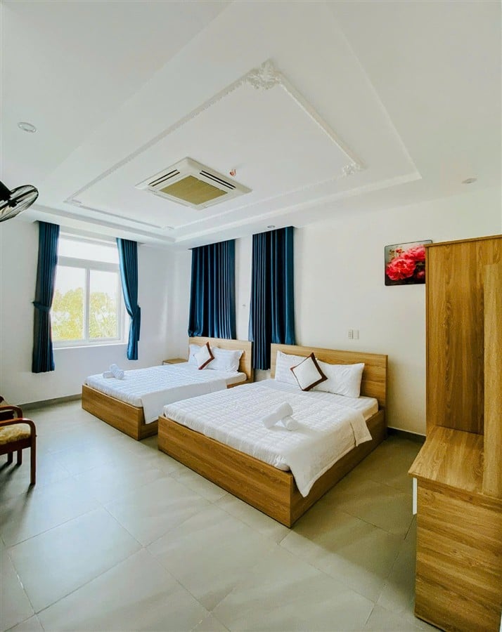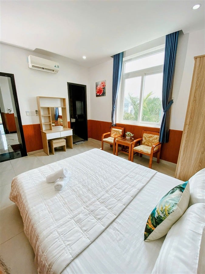 ✅ Nội thất hiện đại: máy lạnh, quạt trần, rèm chống muỗi, chăn ga gối tiêu chuẩn khách sạn
