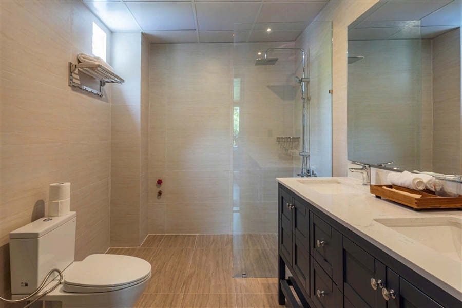 Villa gồm 4 phòng ngủ với 4 giường lớn và 8 nệm phụ, sức chứa tiêu chuẩn 14 khách, đáp ứng tối đa nhu cầu nhóm đông. Mỗi phòng ngủ được bố trí hiện đại, trang bị TV, máy lạnh, gương toàn thân, máy sấy tóc và nội thất tiện nghi, tạo không gian nghỉ ngơi thư giãn. 5 WC tiện nghi với vòi tắm nóng lạnh, khăn tắm và đồ dùng cá nhân đảm bảo tiện lợi cho tất cả khách lưu trú.