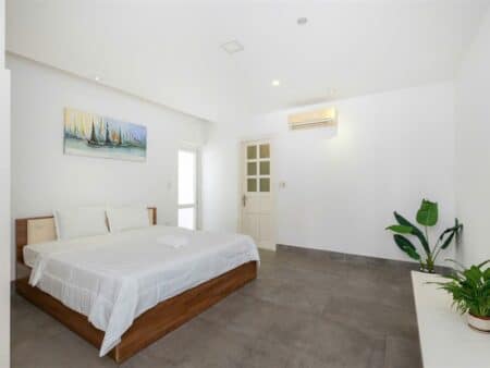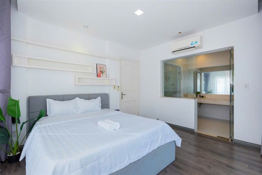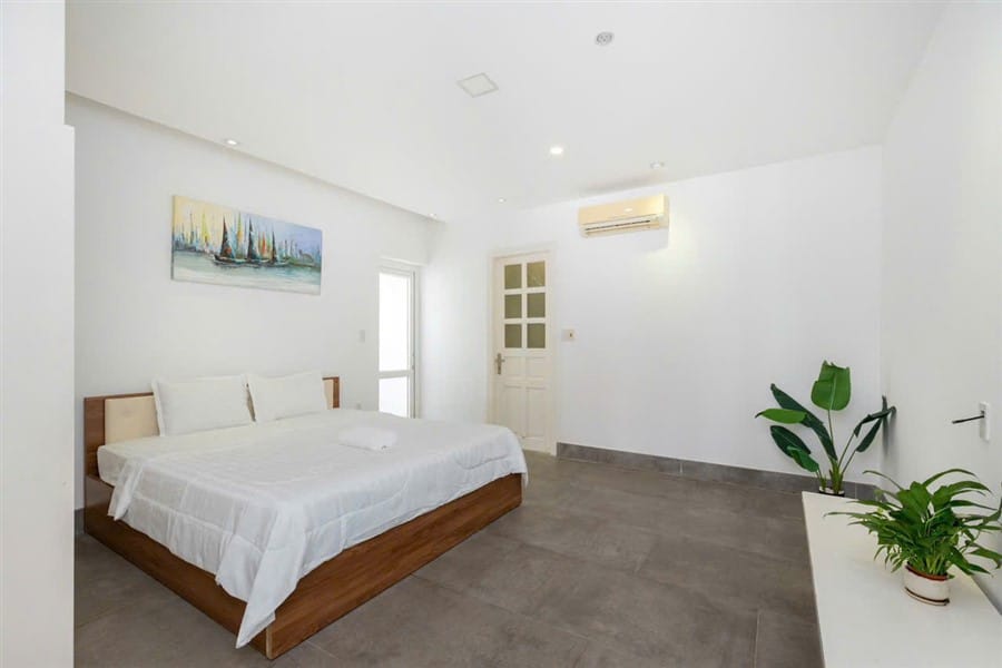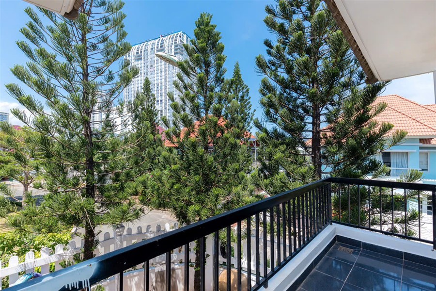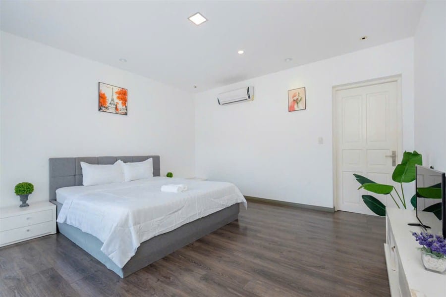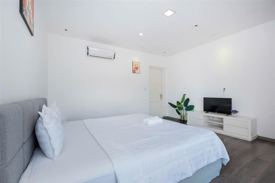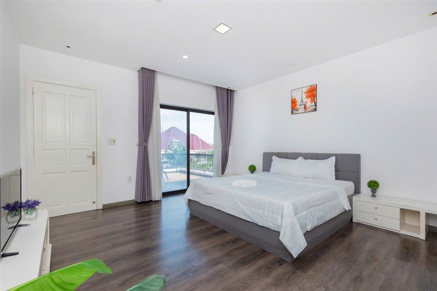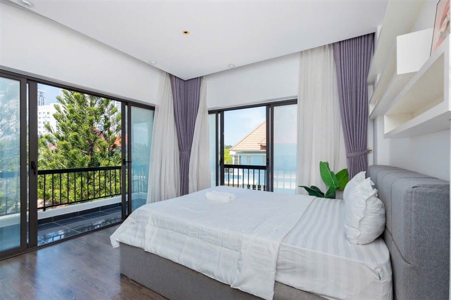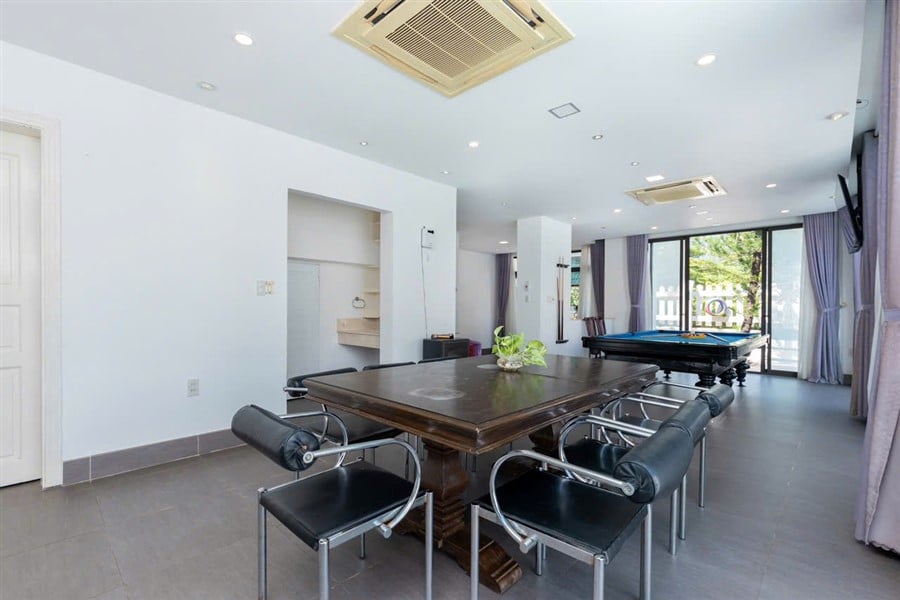 Villa có tổng cộng 5 phòng ngủ với 5 giường lớn và 3 nệm phụ, sức chứa tiêu chuẩn 15 khách và tối đa 25 khách khi sử dụng thêm nệm phụ. Tất cả phòng đều có máy lạnh, ban công riêng và WC tiện nghi, đảm bảo sự thoải mái tối đa. Nội thất hiện đại kết hợp với phòng khách rộng rãi, sofa sang trọng, hệ thống TV, bàn bida, karaoke và ghế massage, mang đến trải nghiệm thư giãn và giải trí trọn vẹn cho mọi thành viên.