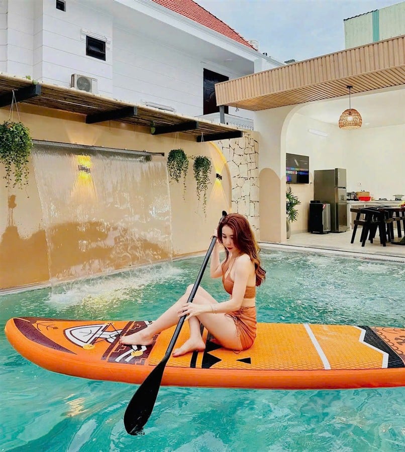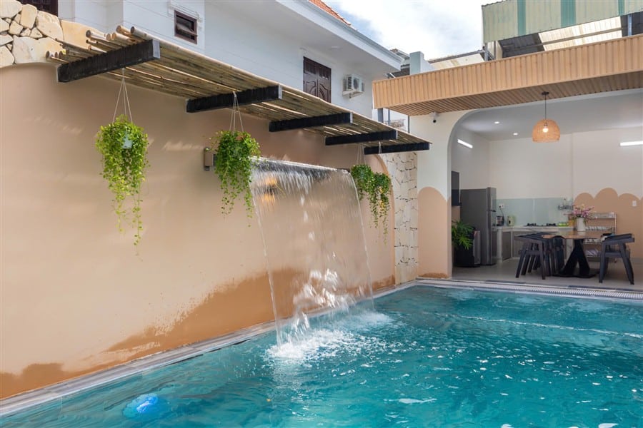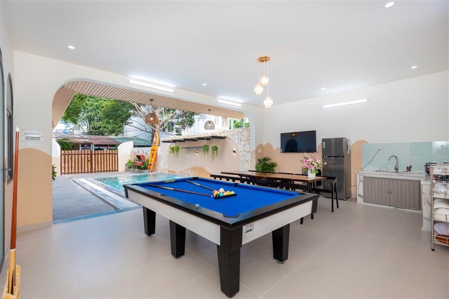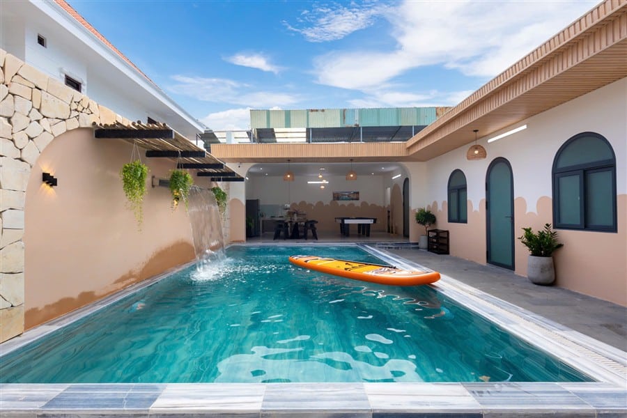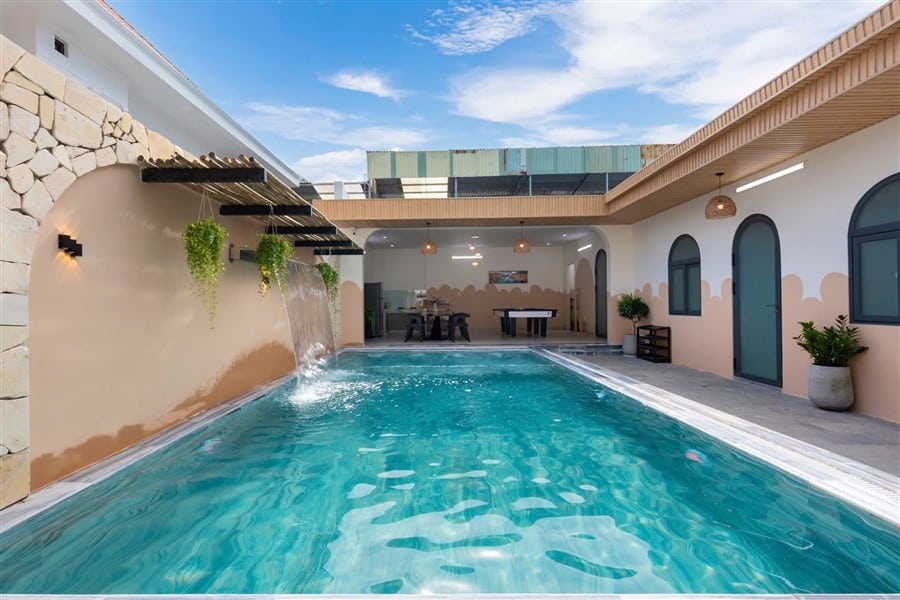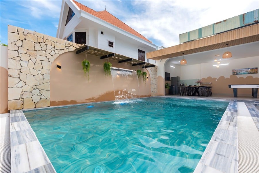 Hồ bơi 50m² có sục massage, sân BBQ ngoài trời, bàn bida, bi lắc và phòng karaoke riêng, mang đến trải nghiệm nghỉ dưỡng trọn gói