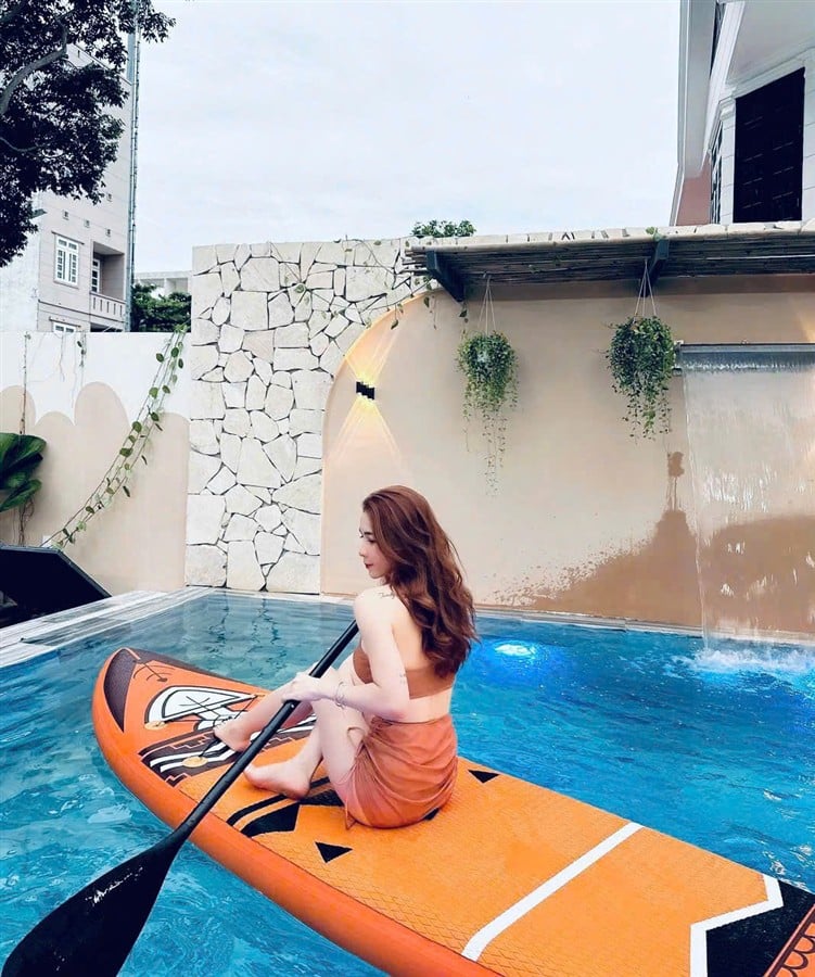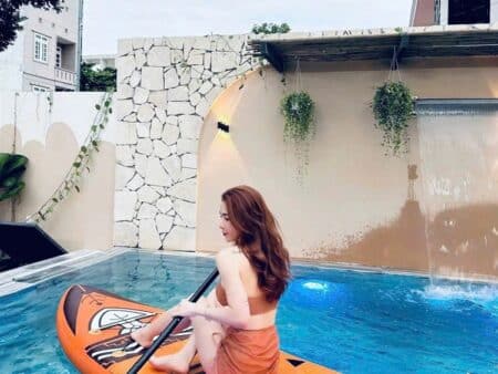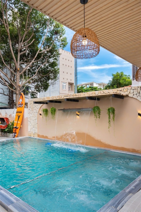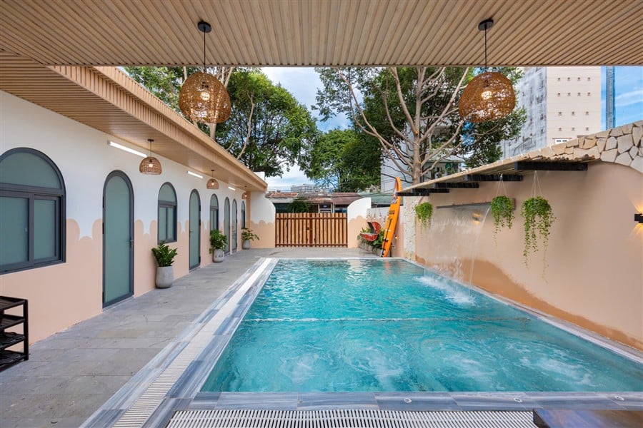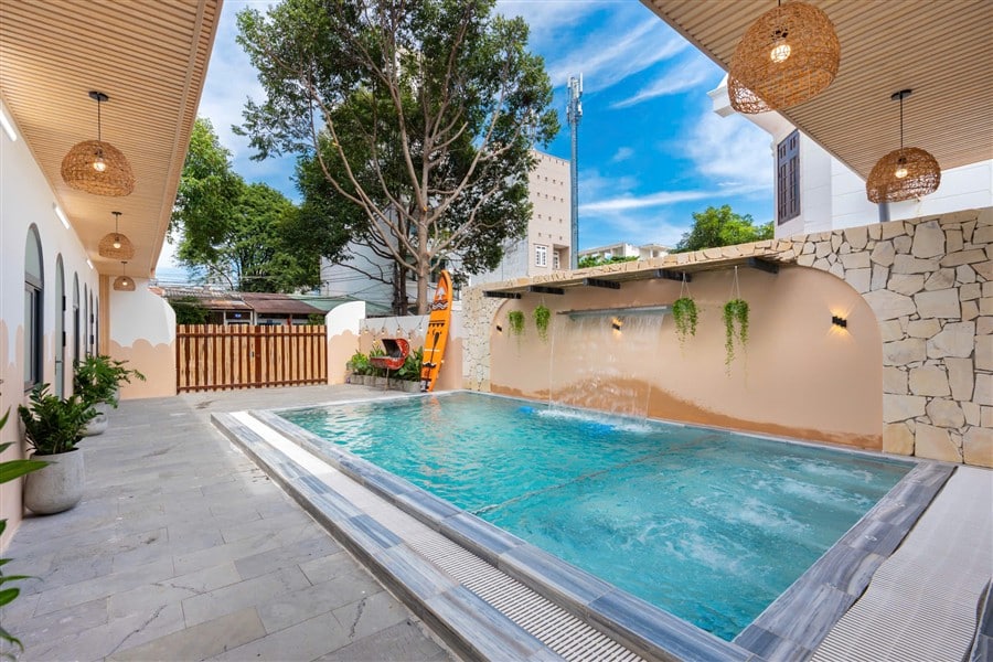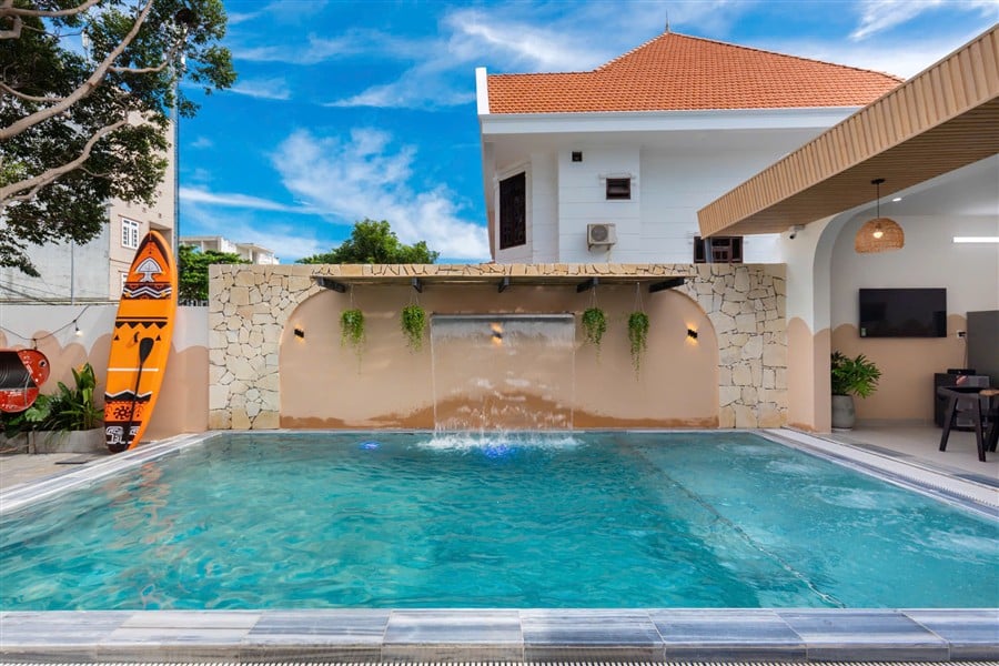 Hồ bơi 50m² có sục massage, sân BBQ ngoài trời, bàn bida, bi lắc và phòng karaoke riêng, mang đến trải nghiệm nghỉ dưỡng trọn gói