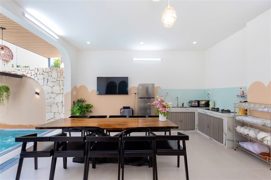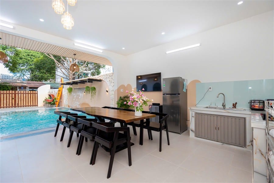 Không gian sinh hoạt chung rộng rãi, thoáng mát, thích hợp tổ chức các hoạt động nhóm hoặc buổi tiệc ngoài trời