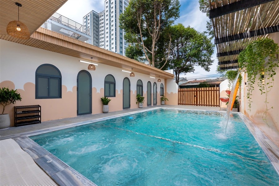 Hồ bơi ngoài trời 50m², thoáng mát, có khu vực riêng cho trẻ em và sục massage Jacuzzi