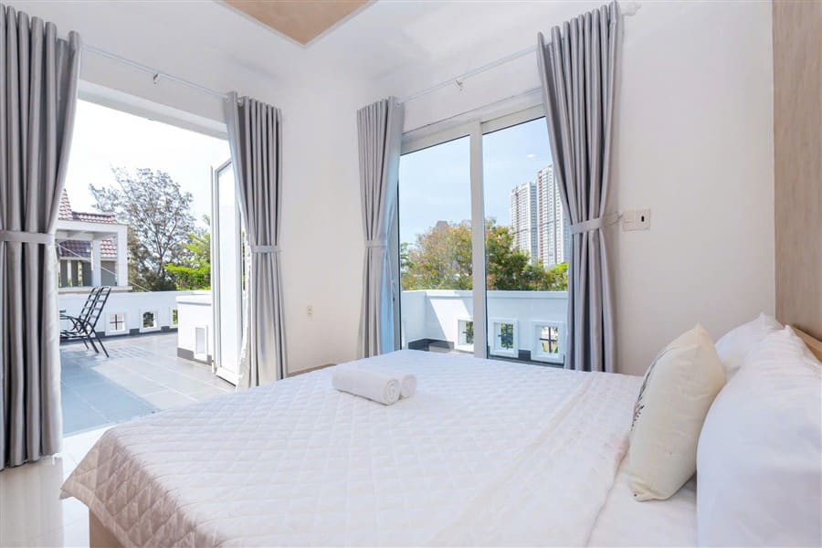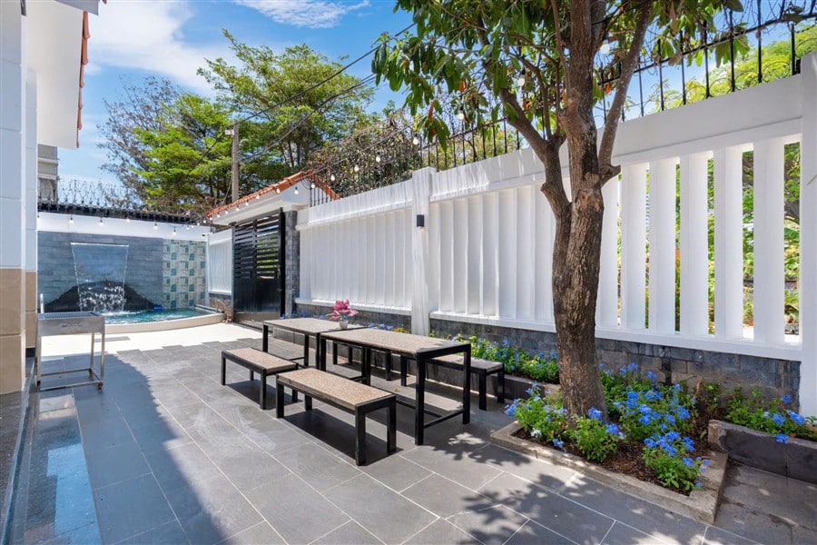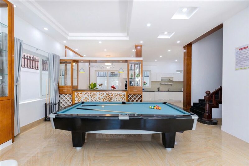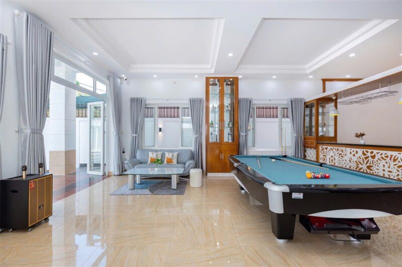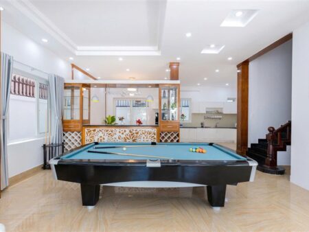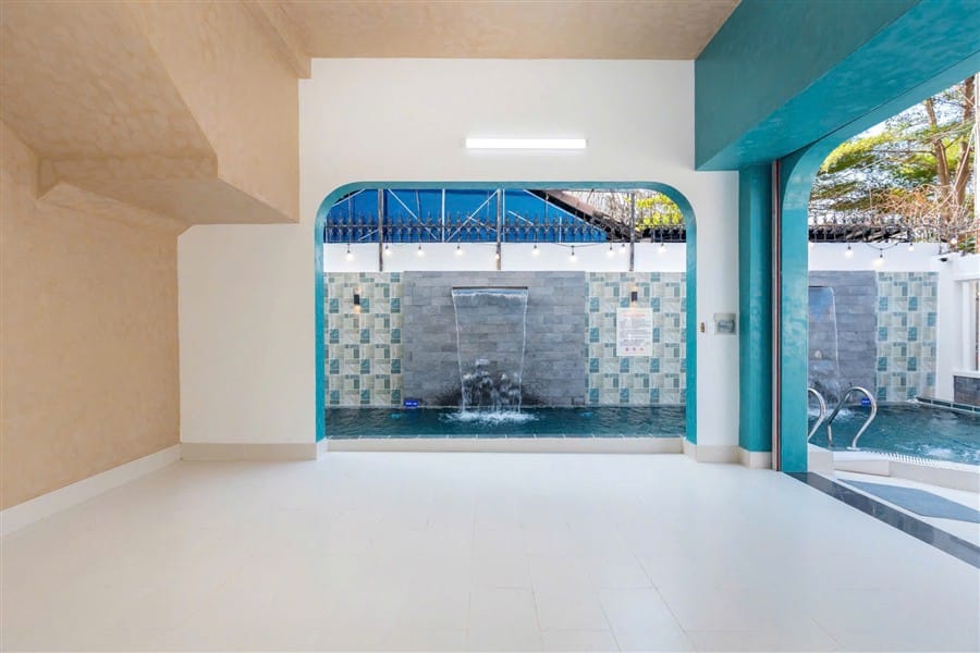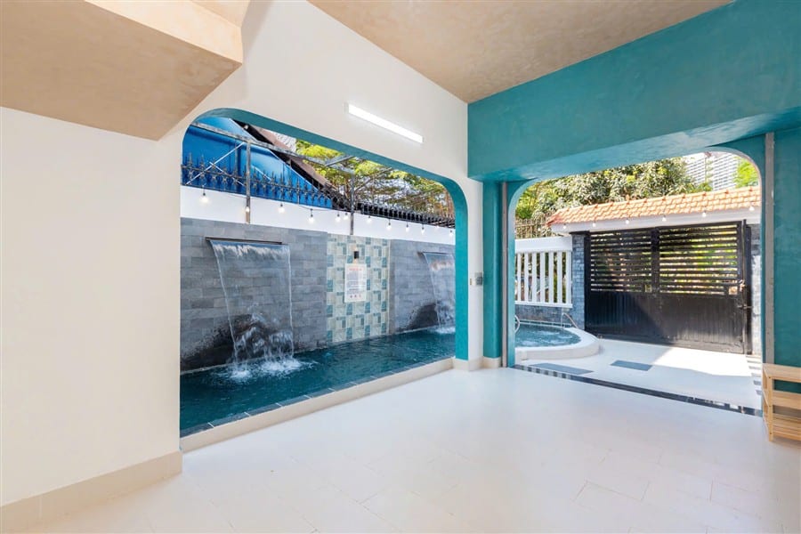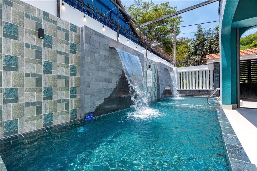 Villa gồm 7 phòng ngủ với 8 giường lớn, 2 nệm phụ và 6 phòng vệ sinh (6 phòng đơn, 1 phòng đôi), đáp ứng nhu cầu nghỉ dưỡng cho nhóm từ 15–25 khách. Hồ bơi có sục massage Jacuzzi và thác nước đôi, độ sâu người lớn 1,3m, hồ trẻ em 0,7m, trang bị đầy đủ áo phao. Sân rộng, sân thượng thoáng mát, kết hợp khu vực BBQ ngoài trời và bếp đầy đủ dụng cụ, giúp du khách tận hưởng kỳ nghỉ tiện nghi và trọn vẹn.