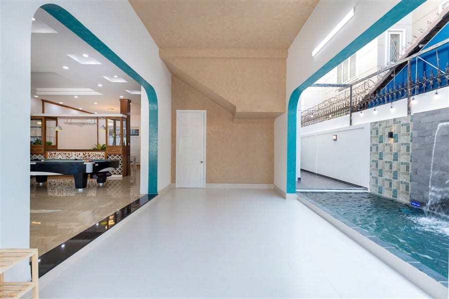 Tầng trệt: Phòng khách, bếp, sân BBQ, hồ bơi, WC chung