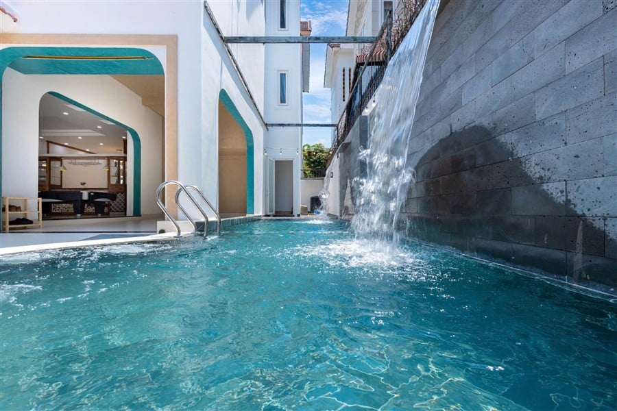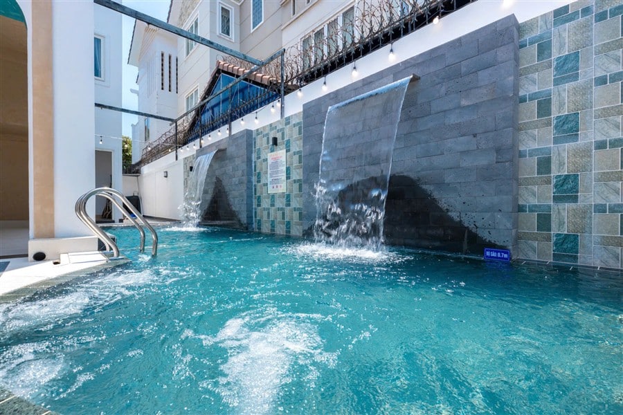Hồ bơi Jacuzzi 50m², thác nước đôi, trang bị áo phao